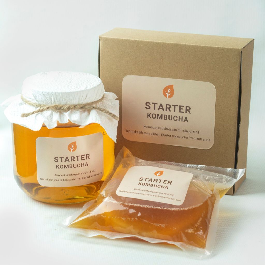 Starter Kit Kombucha berisi air teh fermentasi 500ml dan Scoby 9-13mm untuk kamu bisa membuat Teh Kombucha sendiri.